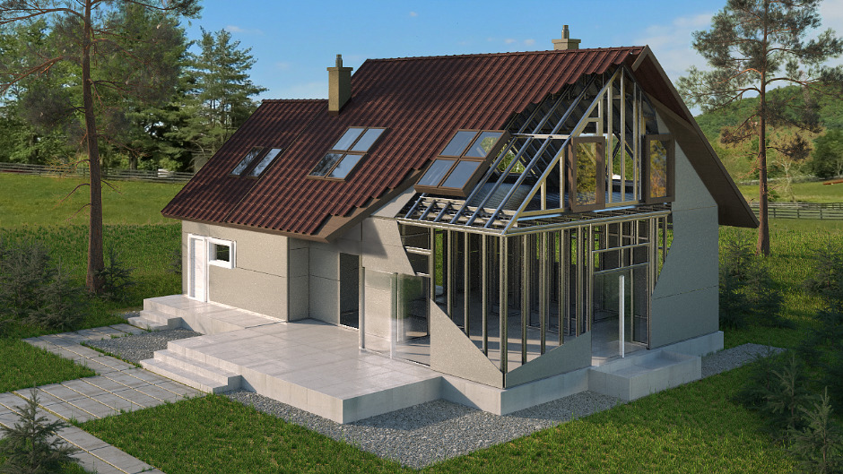 În momentul în care fundaţia este uscată se poate începe construirea casei. Structura casei este formată din ansamblul profilelor C şi U, care sunt fabricate dintr-un oţel superior. Faza de construcţie prezentată se execută aproximativ între unu şi trei săptămâni. Pe exteriorul şi acoperişul casei se vor monta nişte plăci speciale care sunt rezistente la apă şi la foc.